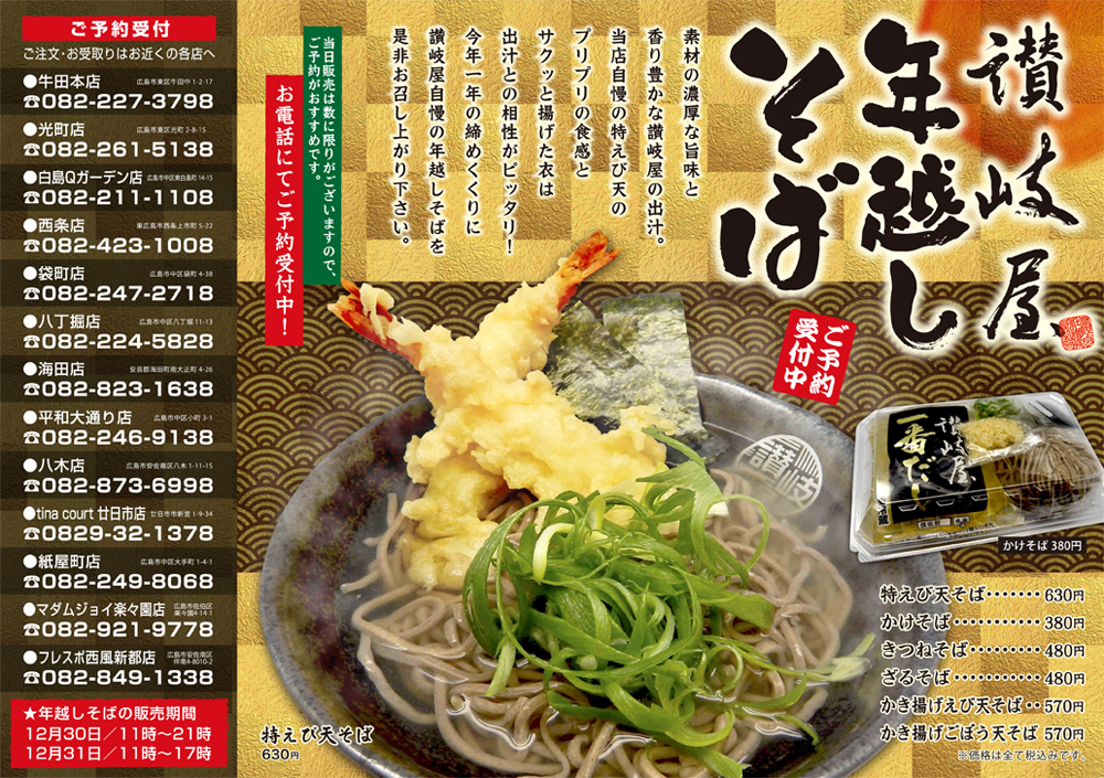 年越しそばのご予約受付を開始しました。生そばと讃岐屋オリジナルの出汁、刻んだネギなどがセットになっており、特海老天そば、きつねそばなどもご用意しております。