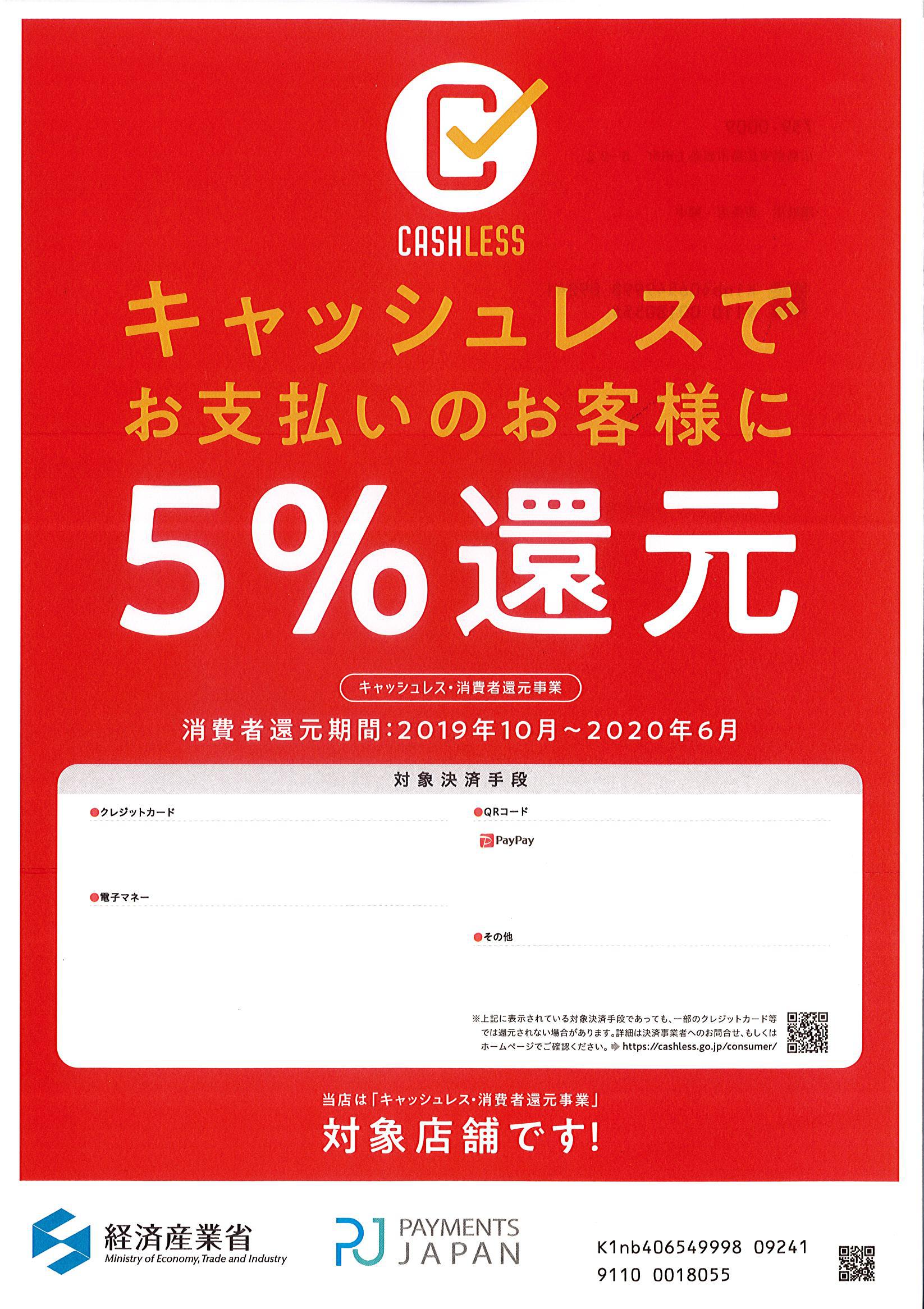 キャッシュレス決済でお支払いのお客様に5%還元!!